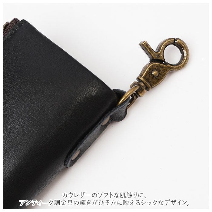 ・カウレザーのソフトな肌触りに、アンティーク調金具の輝きがひそかに映えるシックなデザイン。使い込むごとに表情を変える、美しい経年変化が楽しめるのも魅力のひとつ。(※天然皮革を使用しているため、カラーごとにシボのきめ細かさ、革表面のツヤ感などが異なります。予めご了承ください。)