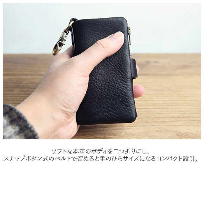 ・ソフトな本革のボディを二つ折りにし、スナップボタン式のベルトで留めると手のひらサイズになるコンパクト設計。