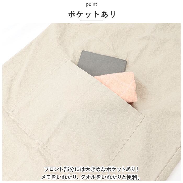 ・頭からスポっと被るだけの簡単着用。腰ひもがないタイプなので、紐を結び直す手間が無くラクチン。