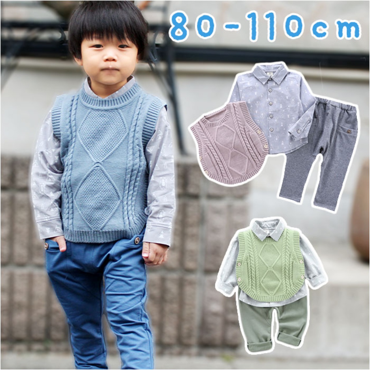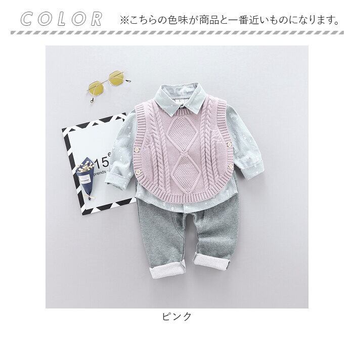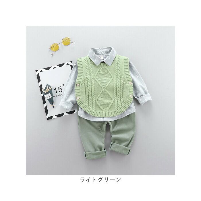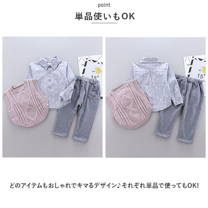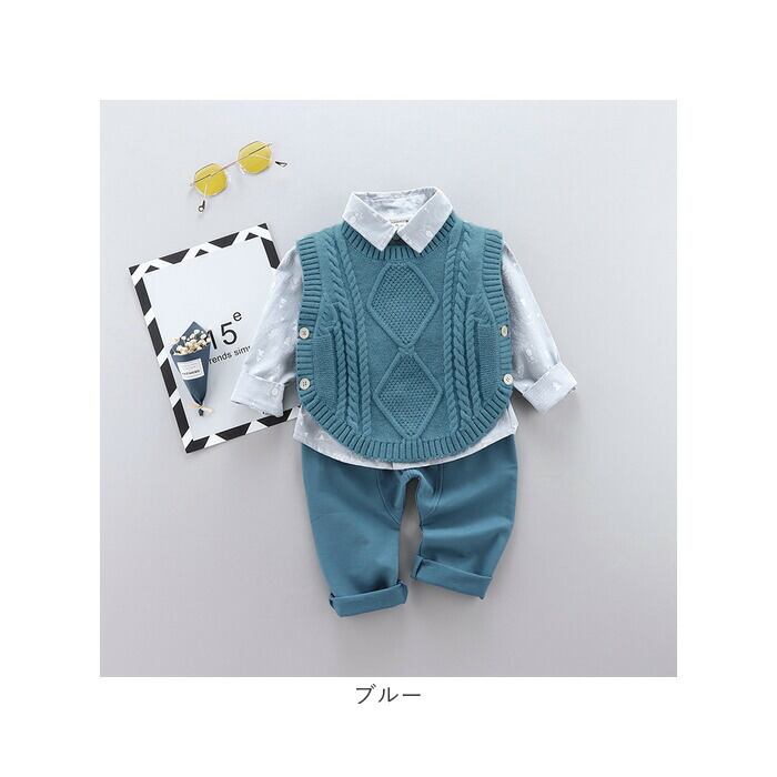 ・ニットベスト・長袖シャツ・長ズボンが付いたお買い得なセットアップアイテム。秋冬のカジュアルコーデに最適☆