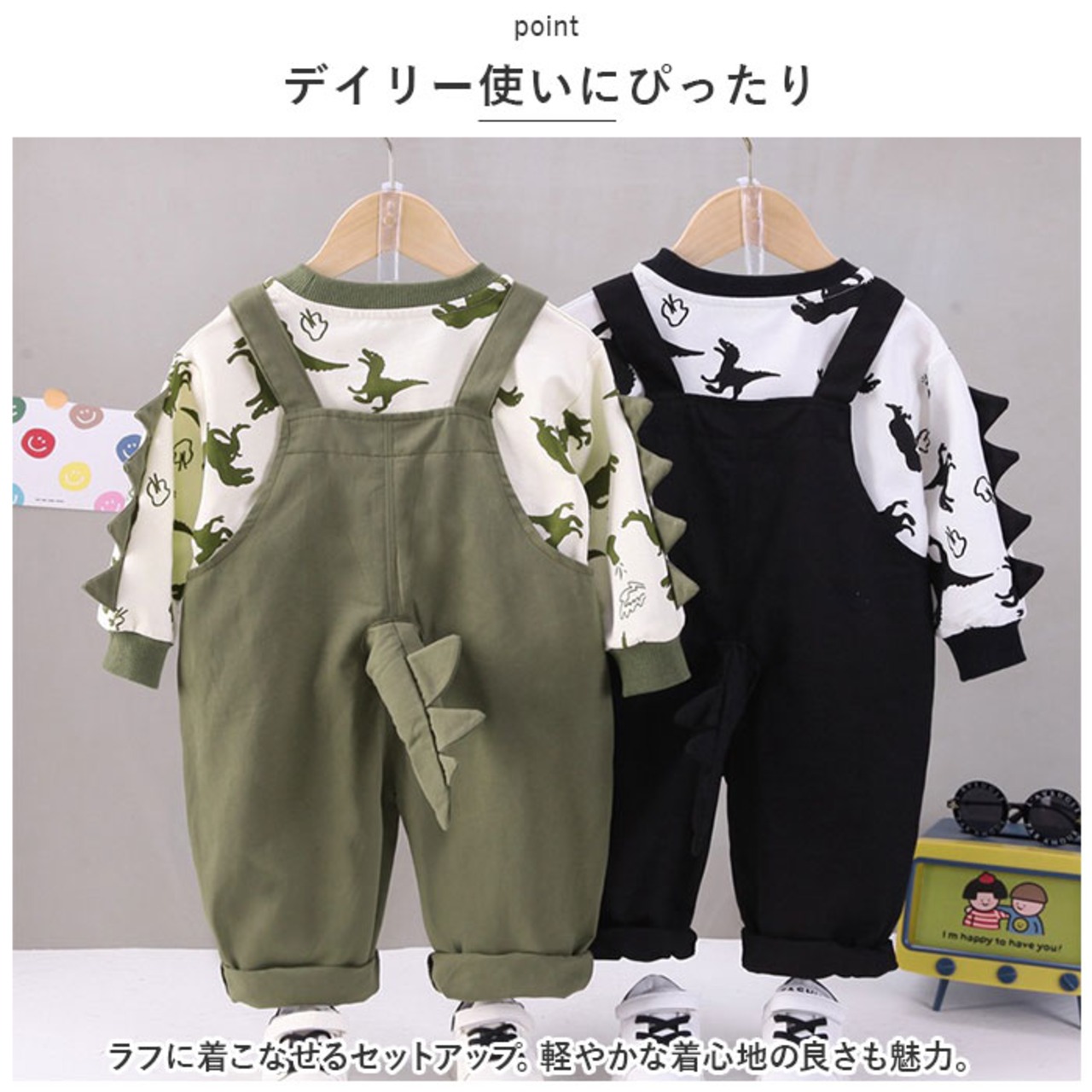 ・長袖トップスとオーバーオールのセット。一緒に合わせるのはもちろん、それぞれ単体使いもできて、コーデの幅が広がるアイテム。