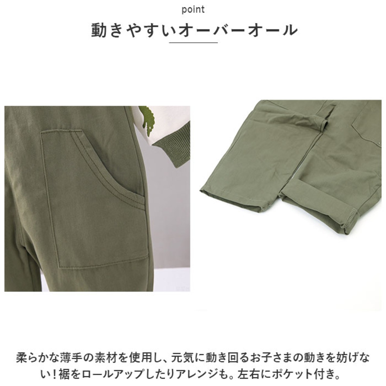 ・柔らかな薄手の素材を使用し、元気に動き回るお子さまの動きを妨げない!裾をロールアップしたりアレンジも。左右にポケット付き。