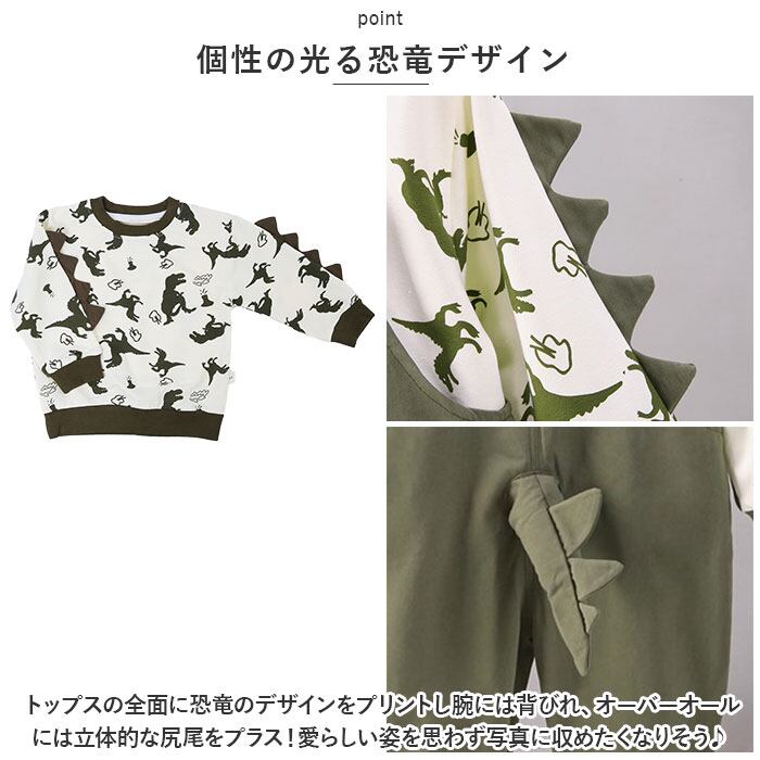 ・トップスの全面に恐竜のデザインをプリントし腕には背びれ、オーバーオールには立体的な尻尾をプラス!愛らしい姿を思わず写真に収めたくなりそう♪