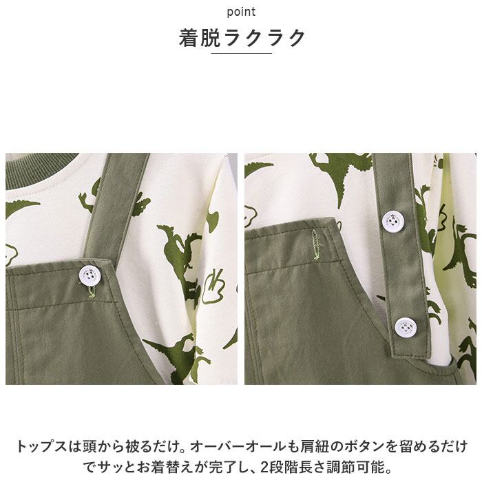 ・トップスは頭から被るだけ。オーバーオールも肩紐のボタンを留めるだけでサッとお着替えが完了し、2段階長さ調節可能。