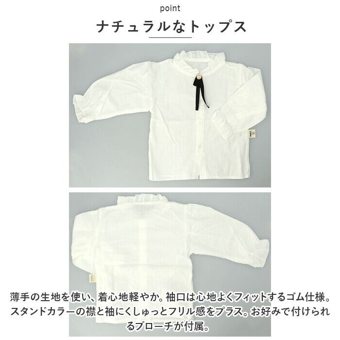 ・薄手の生地を使い、着心地軽やか。袖口は心地よくフィットするゴム仕様。スタンドカラーの襟と袖にくしゅっとフリル感をプラス。お好みで付けられるブローチが付属。