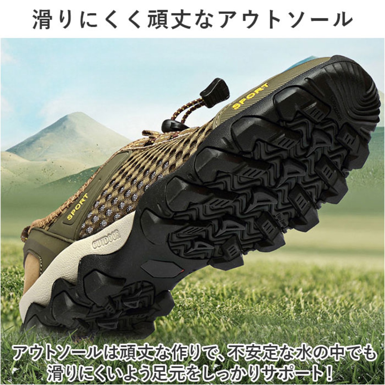 ・アウトソールは頑丈な作りで、不安定な水の中でも滑りにくいよう足元をしっかりサポート!