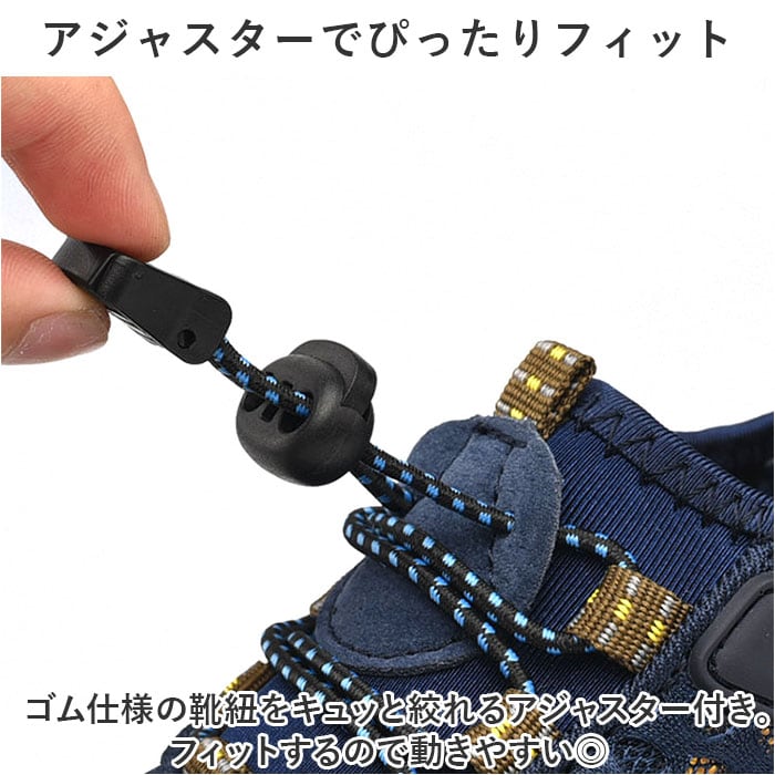 ・ゴム仕様の靴紐をキュッと絞れるアジャスター付き。フィットするので動きやすい◎