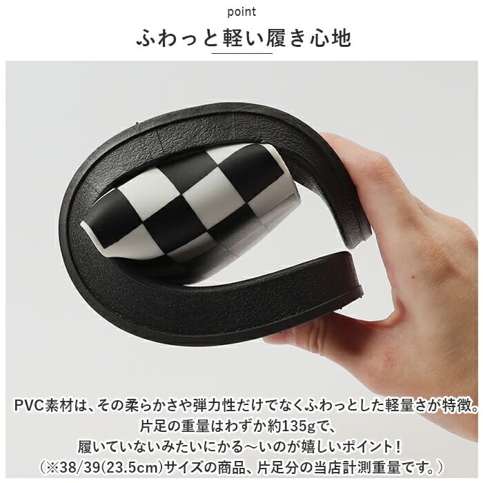 ・PVC素材は、その柔らかさや弾力性だけでなくふわっとした軽量さが特徴。片足の重量はわずか約135gで、履いていないみたいにかる~いのが嬉しいポイント!(※38/39(23.5cm)サイズの商品、片足分の当店計測重量です。)