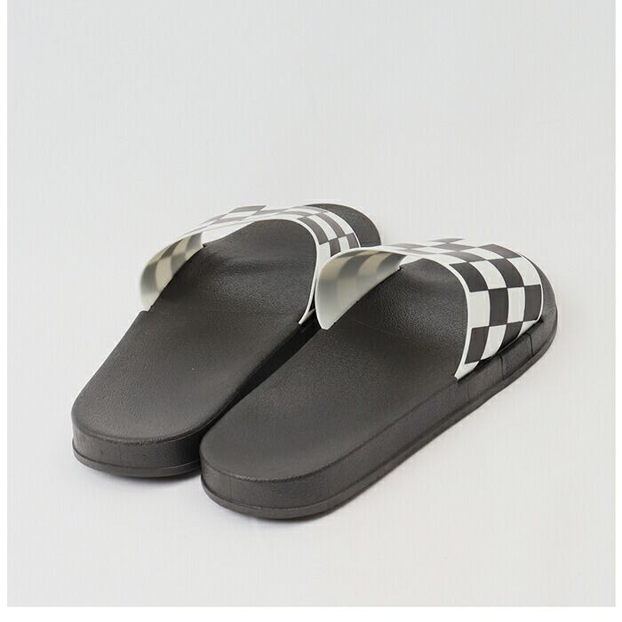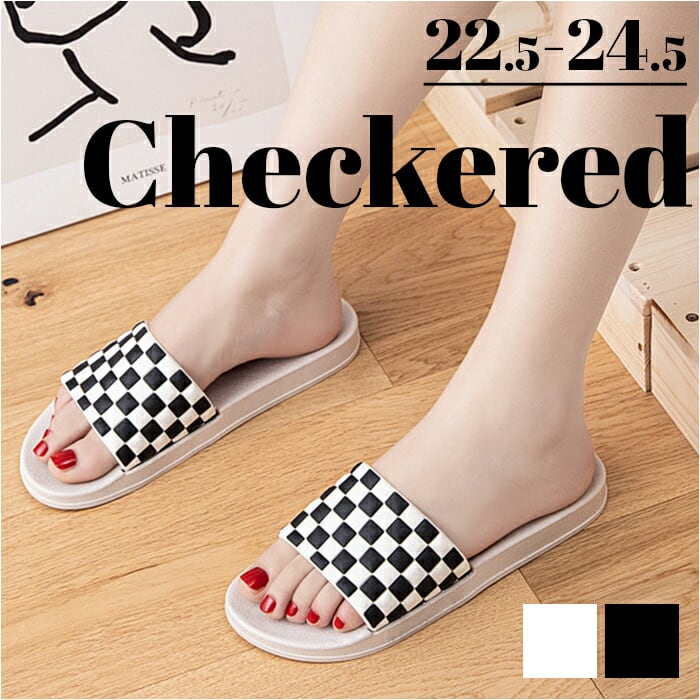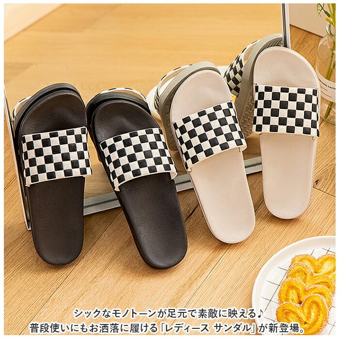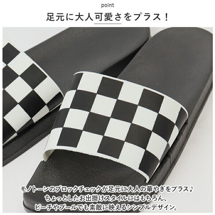 ・モノトーンのブロックチェックが足元に大人の華やぎをプラス♪ちょっとしたお出掛けスタイルにはもちろん、ビーチやプールでも素敵に映えるシンプルデザイン。