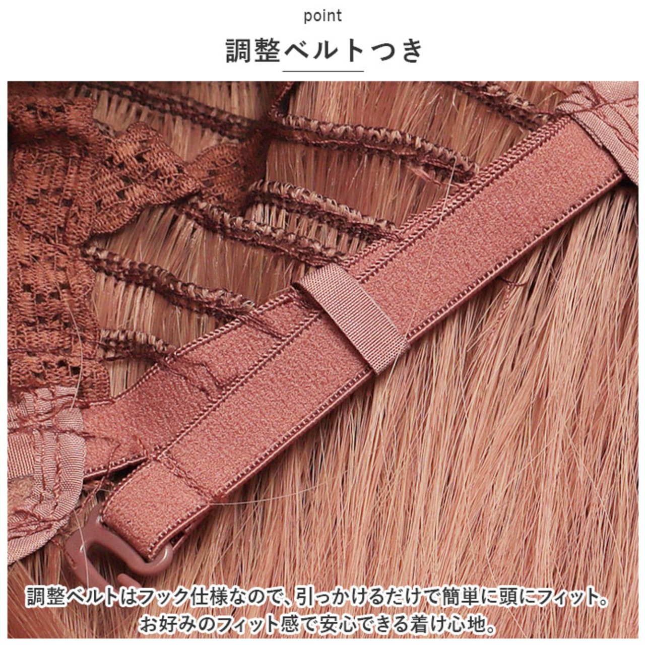 ・調整ベルトはフック仕様なので、引っかけるだけで簡単に頭にフィット。お好みのフィット感で安心できる着け心地。