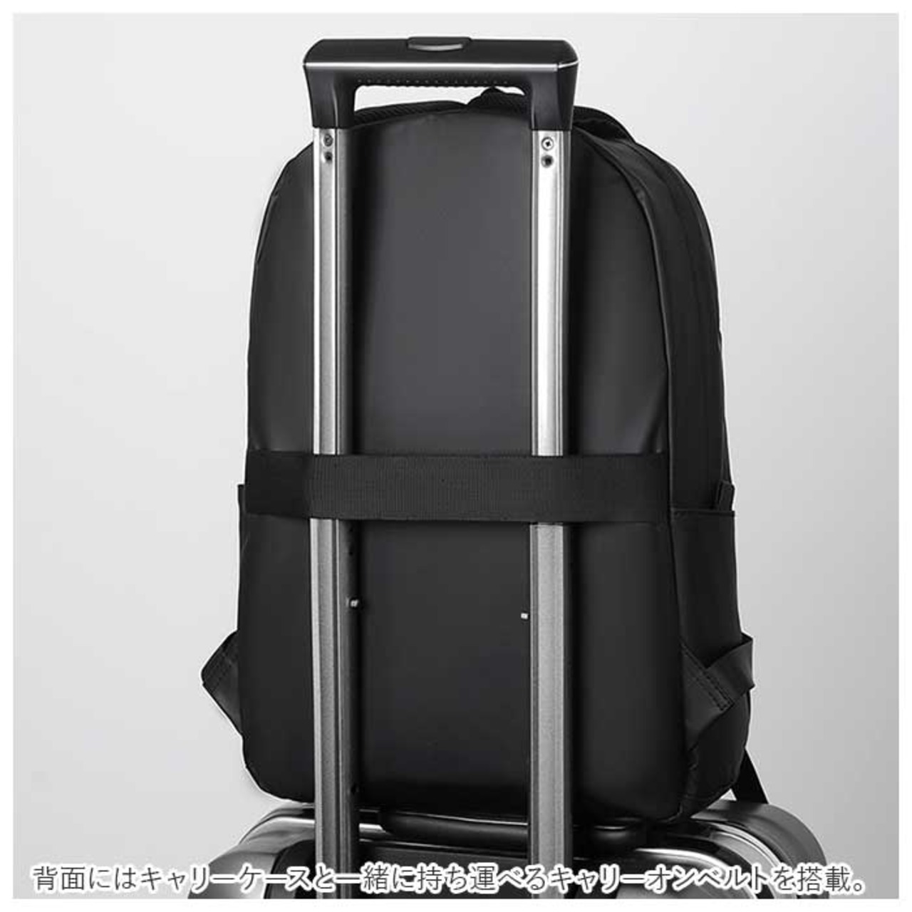 ・背面にはキャリーケースと一緒に持ち運べるキャリーオンベルトを搭載。