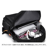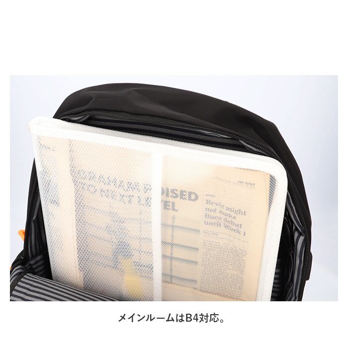 ・メインルームはB4対応。ダブルファスナー仕様で大きく開き、中の荷物を出し入れしやすい作り。