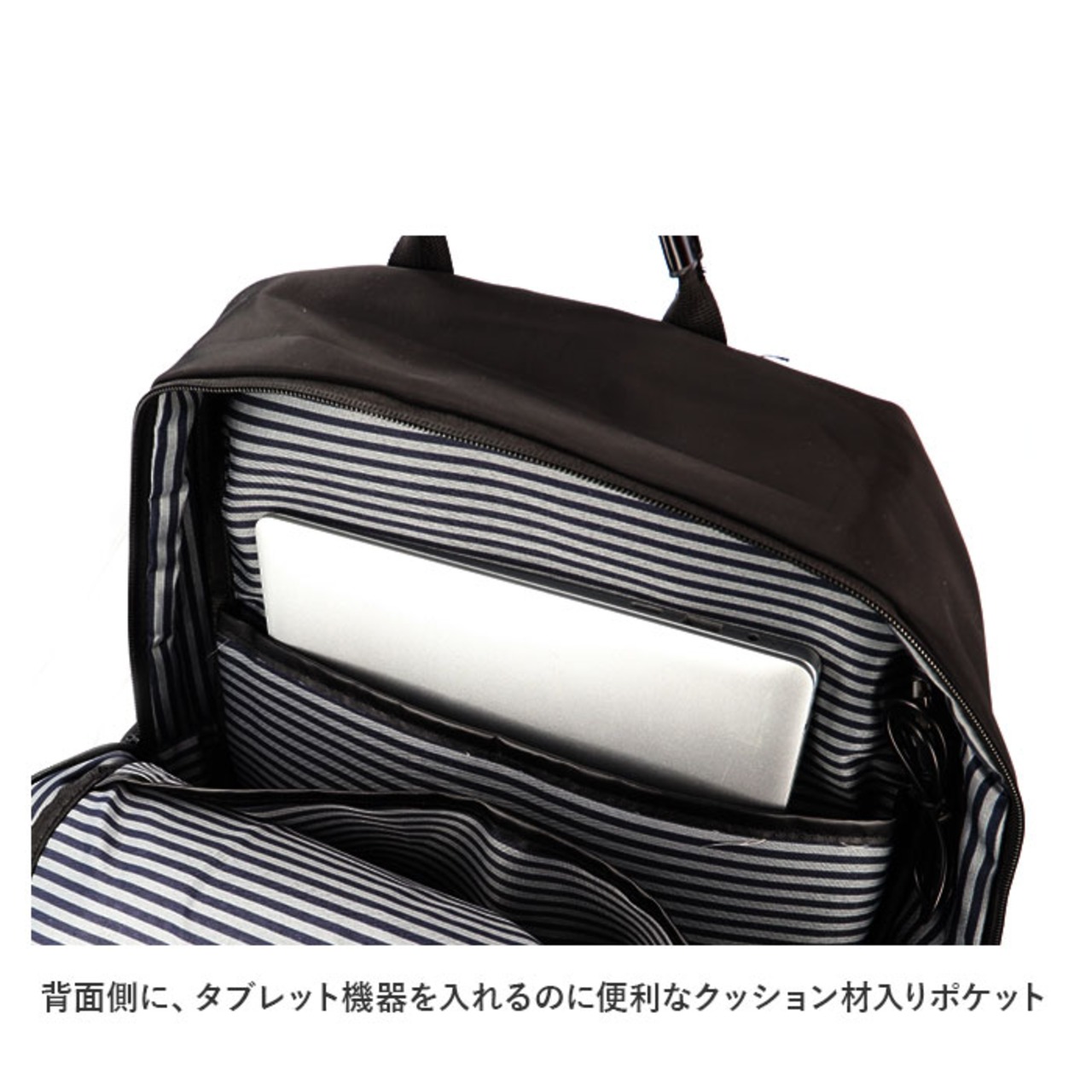 ・メインルーム内には背面側に、タブレット機器を入れるのに便利なクッション材入りポケットとフロント側に荷物を分けてしまえるオープンポケットを搭載。