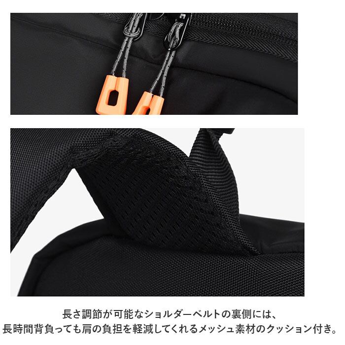 ・長さ調節が可能なショルダーベルトの裏側には、長時間背負っても肩の負担を軽減してくれるメッシュ素材のクッション付き。