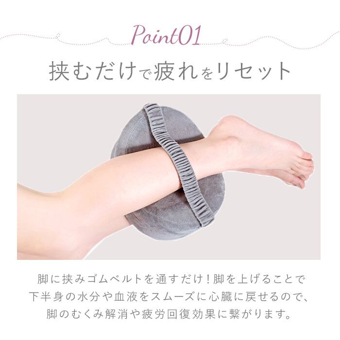 ・ゴムベルトを足首やひざ、太ももなど疲れが気になる部分に通して、中央の凹みに両足を挟むだけ!寝返りしてもズレにくく睡眠中も安心。