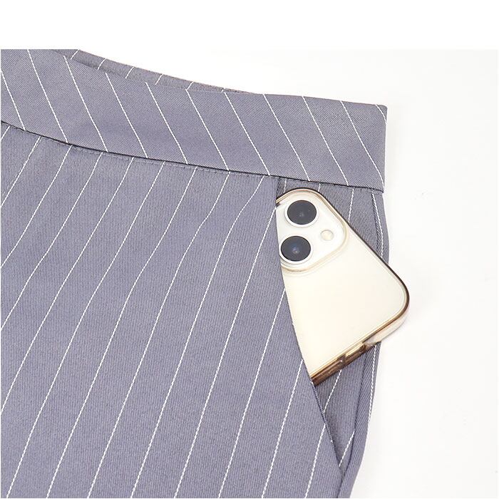 ・フロントファスナー&スライド金具で着脱でき、トップスをインした時もウエストまわりがすっきり。左右にポケット付き。