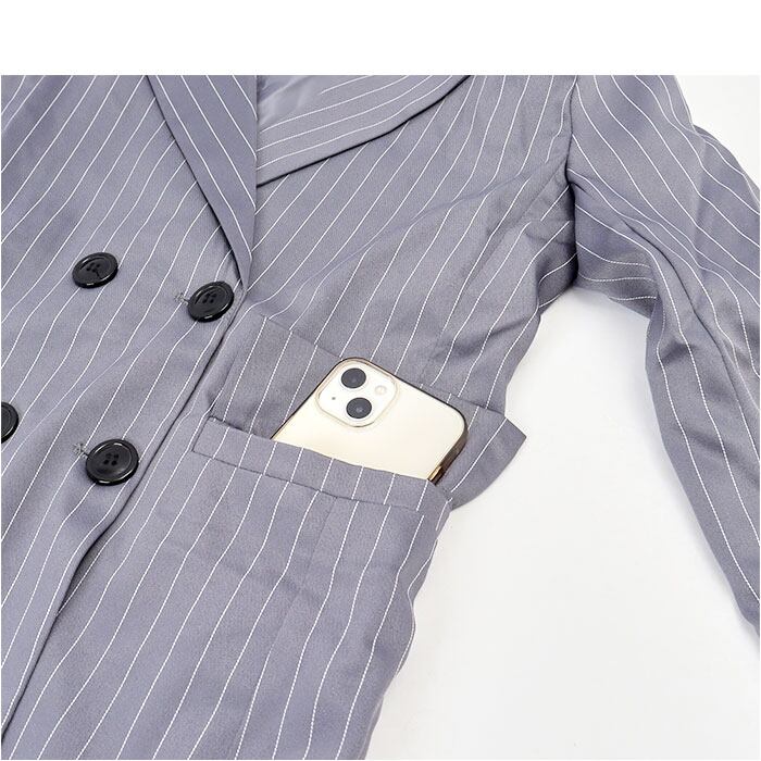 ・フロントボタンが2列になったデザイン。ソフトな肩パッド入りで、美しいカタチをキープ&スッと羽織れる裏地付き。左右にはポケットを配置。