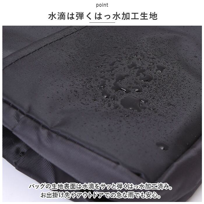 ・バッグの生地表面は水滴をサッと弾くはっ水加工済み。お出掛け先やアウトドアでの急な雨でも安心。