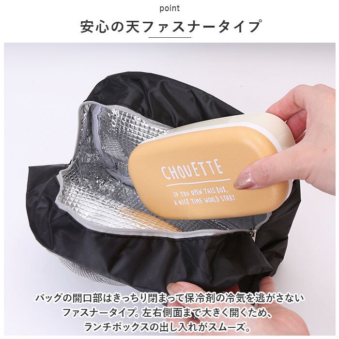 ・バッグの開口部はきっちり閉まって保冷剤の冷気を逃がさないファスナータイプ。左右側面まで大きく開くため、ランチボックスの出し入れがスムーズ。