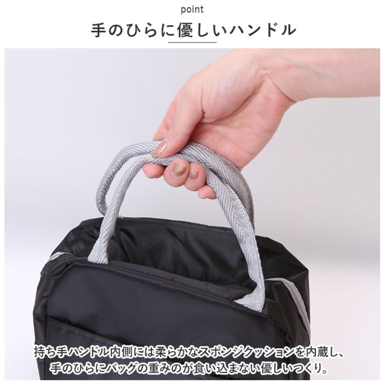 ・持ち手ハンドル内側には柔らかなスポンジクッションを内蔵し、手のひらにバッグの重みのが食い込まない優しいつくり。