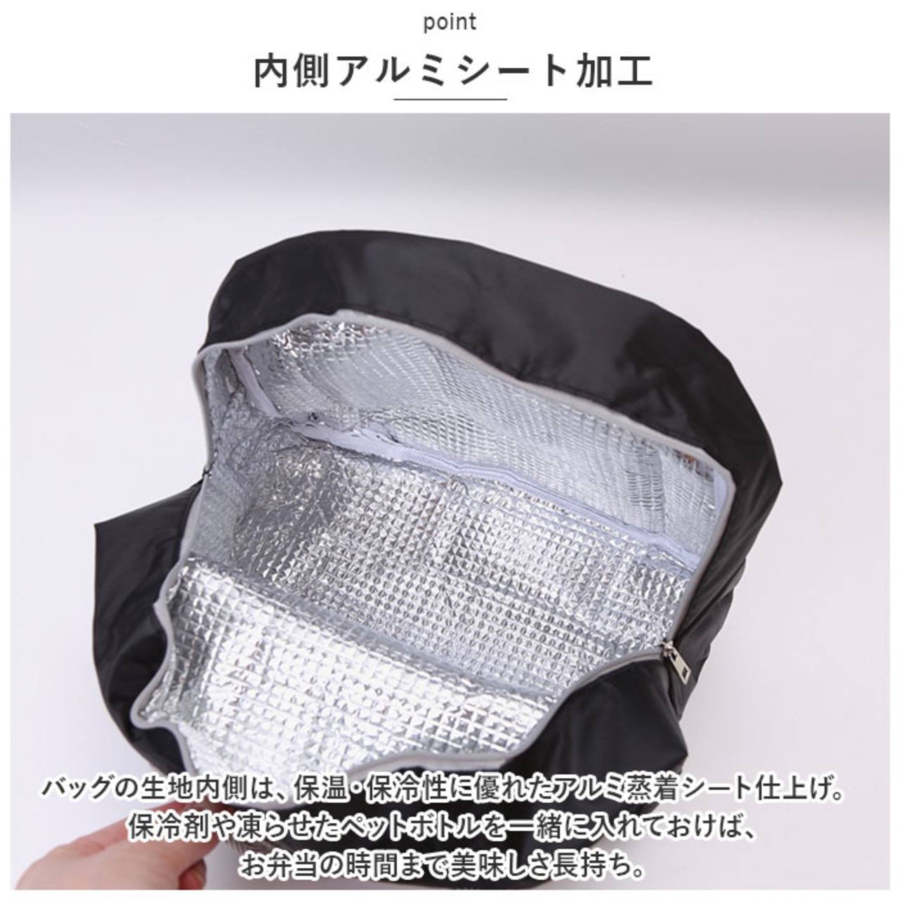 ・バッグの生地内側は、保温・保冷性に優れたアルミ蒸着シート仕上げ。保冷剤や凍らせたペットボトルを一緒に入れておけば、お弁当の時間まで美味しさ長持ち。