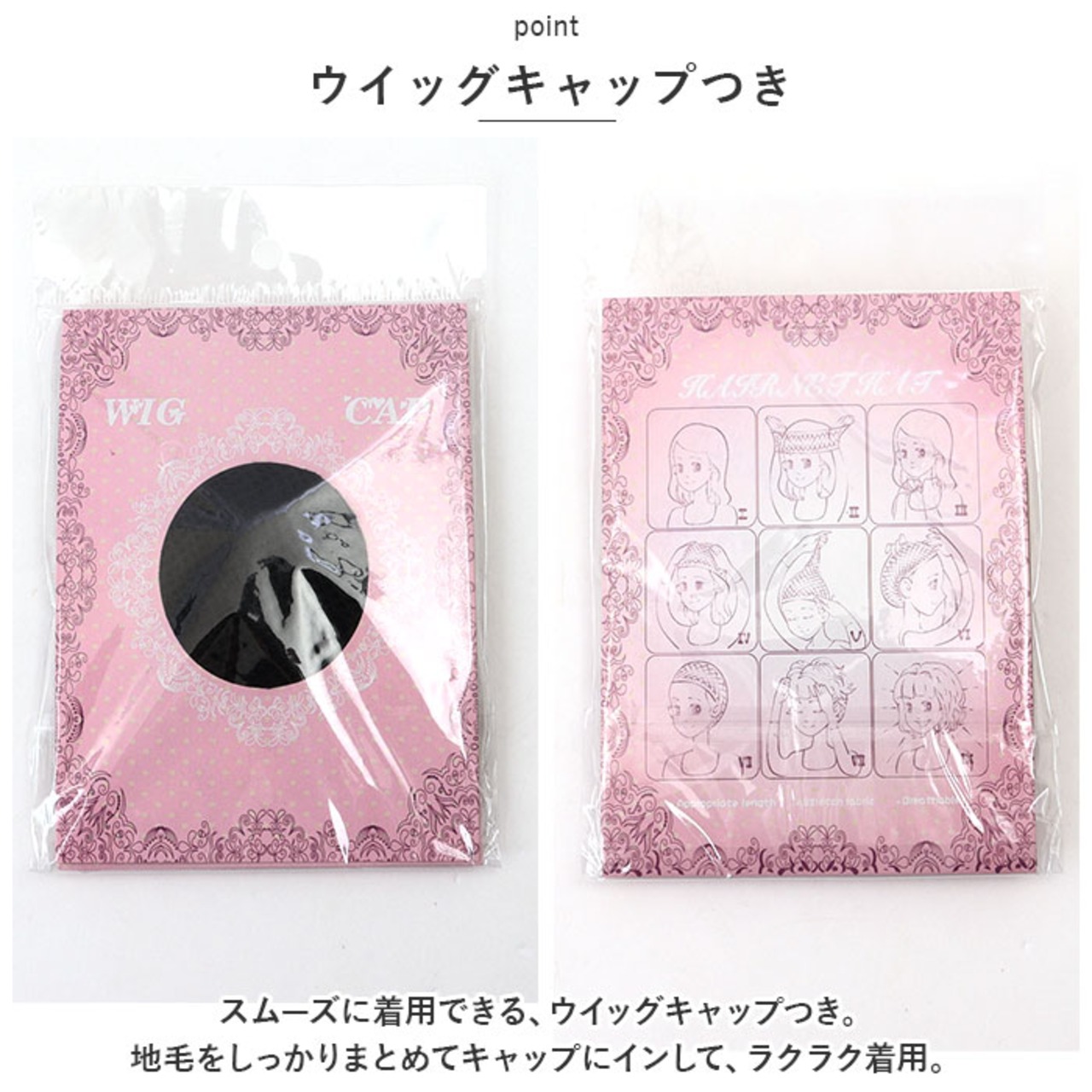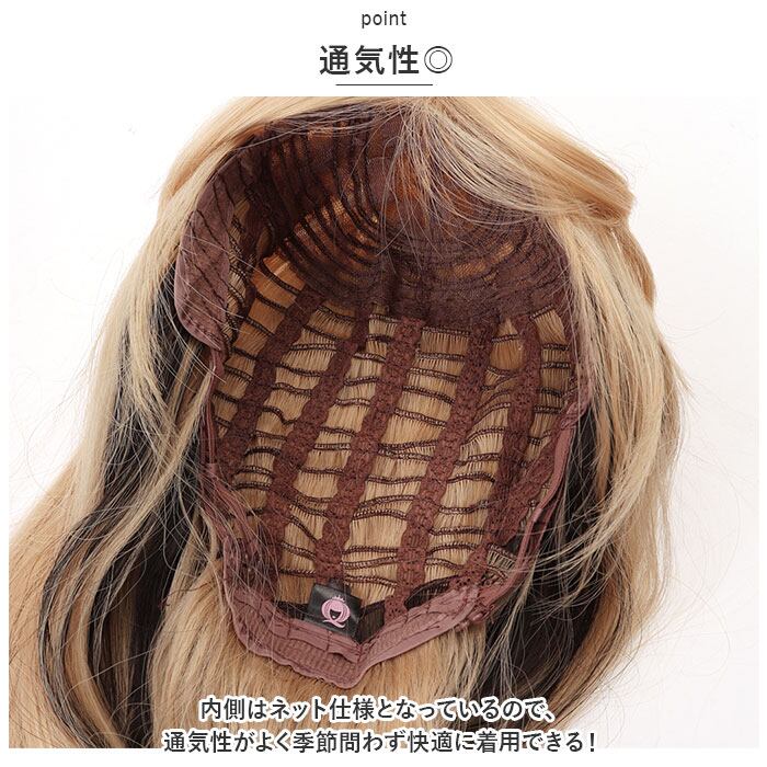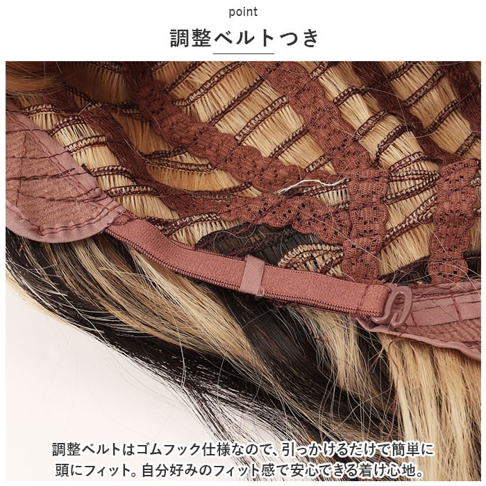 ・スムーズに着用できる、ウイッグキャップつき。地毛をしっかりまとめてキャップにインして、ラクラク着用。