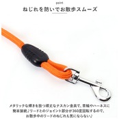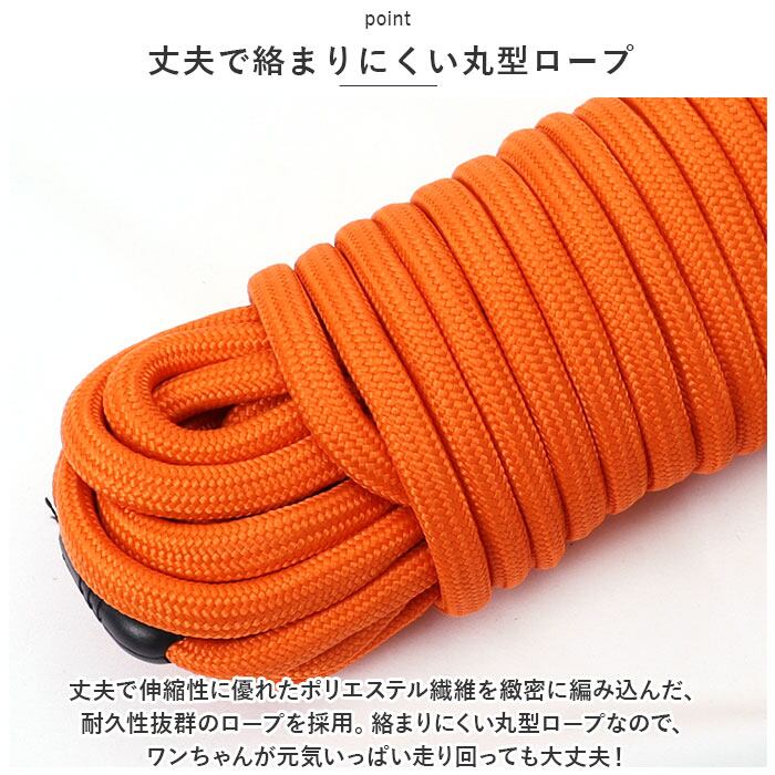 ・丈夫で伸縮性に優れたポリエステル繊維を緻密に編み込んだ、耐久性抜群のロープを採用。絡まりにくい丸型ロープなので、ワンちゃんが元気いっぱい走り回っても大丈夫!