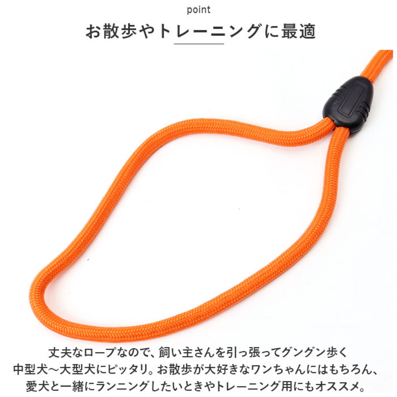 ・丈夫でしっかりとしたつくりのロープなので、飼い主さんを引っ張ってグングン歩く中型犬~大型犬にピッタリ。お散歩が大好きなワンちゃんにはもちろん、愛犬と一緒にランニングしたいときやトレーニング用にもオススメ。