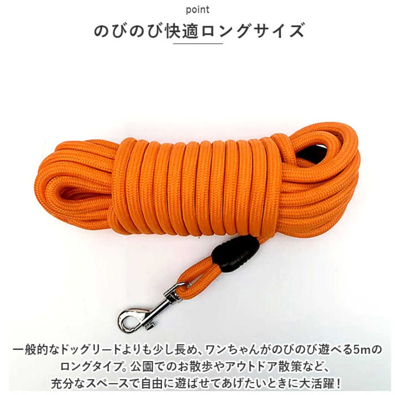 ・一般的なドッグリードよりも少し長め、ワンちゃんがのびのび遊べる5mのロングタイプ。公園でのお散歩やアウトドア散策など、充分なスペースで自由に遊ばせてあげたいときに大活躍!