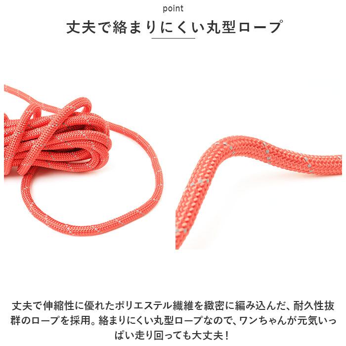 ・丈夫で伸縮性に優れたポリエステル繊維を緻密に編み込んだ、耐久性抜群のロープを採用。絡まりにくい丸型ロープなので、ワンちゃんが元気いっぱい走り回っても大丈夫!