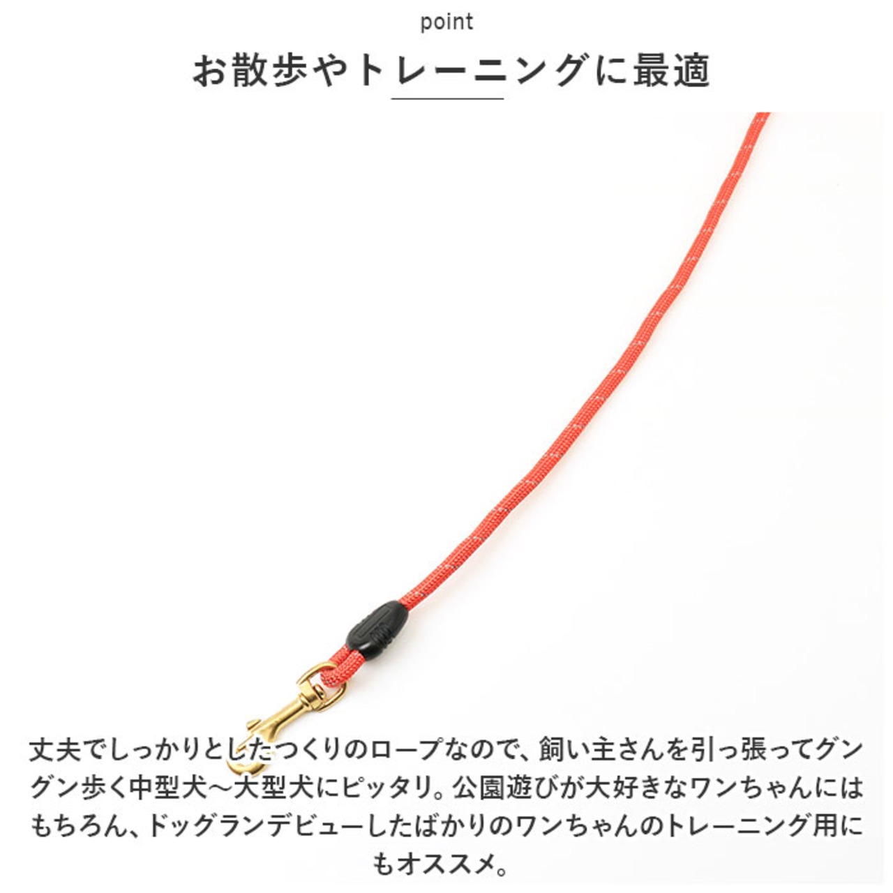 ・丈夫でしっかりとしたつくりのロープなので、飼い主さんを引っ張ってグングン歩く中型犬~大型犬にピッタリ。公園遊びが大好きなワンちゃんにはもちろん、ドッグランデビューしたばかりのワンちゃんのトレーニング用にもオススメ。