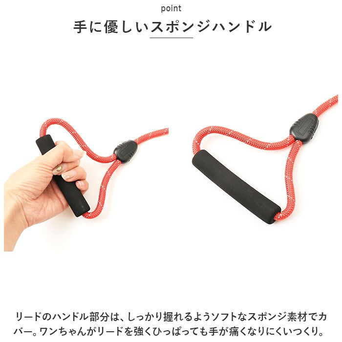 ・リードのハンドル部分は、しっかり握れるようソフトなスポンジ素材でカバー。ワンちゃんがリードを強くひっぱっても手が痛くなりにくいつくり。