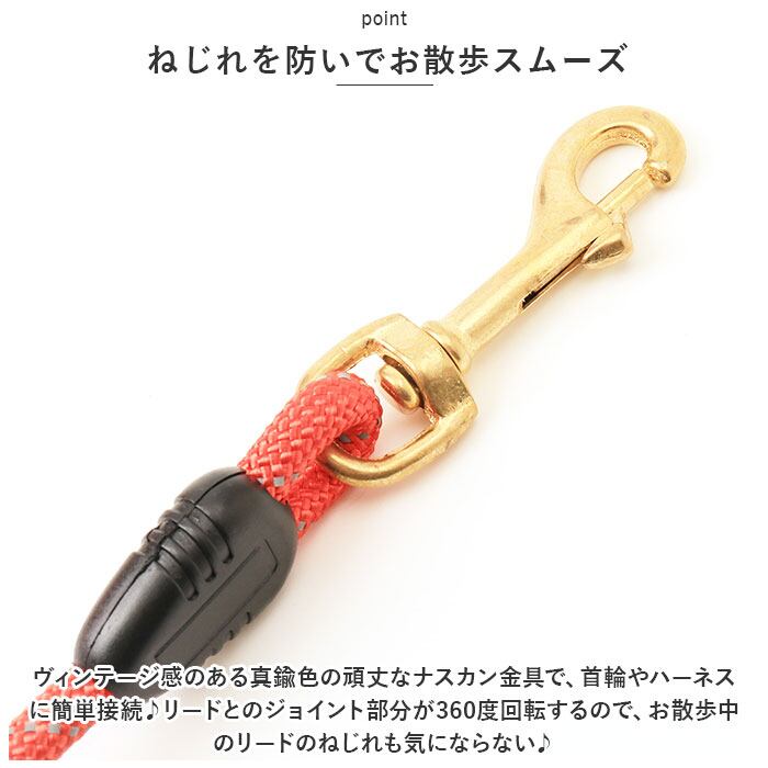 ・ヴィンテージ感のある真鍮色の頑丈なナスカン金具で、首輪やハーネスに簡単接続♪リードとのジョイント部分が360度回転するので、お散歩中のリードのねじれも気にならない♪