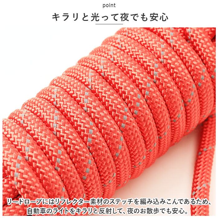 ・リードロープにはリフレクター素材のステッチを編み込みこんであるため、自動車のライトをキラリと反射して、夜のお散歩でも安心。