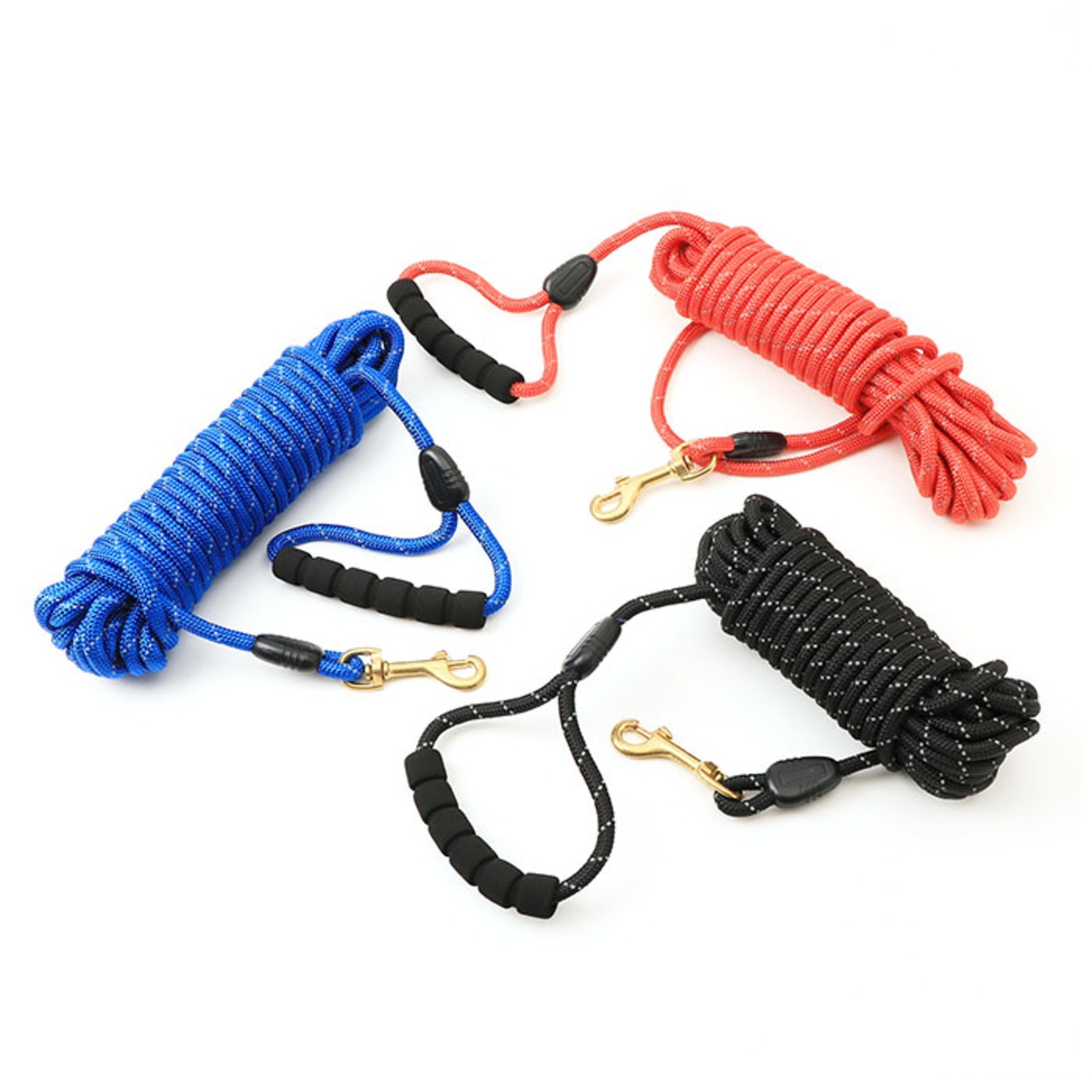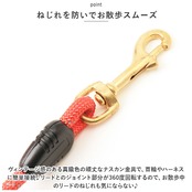 ・丈夫で伸縮性に優れたポリエステル繊維を緻密に編み込んだ、耐久性抜群のロープを採用。絡まりにくい丸型ロープなので、ワンちゃんが元気いっぱい走り回っても大丈夫!