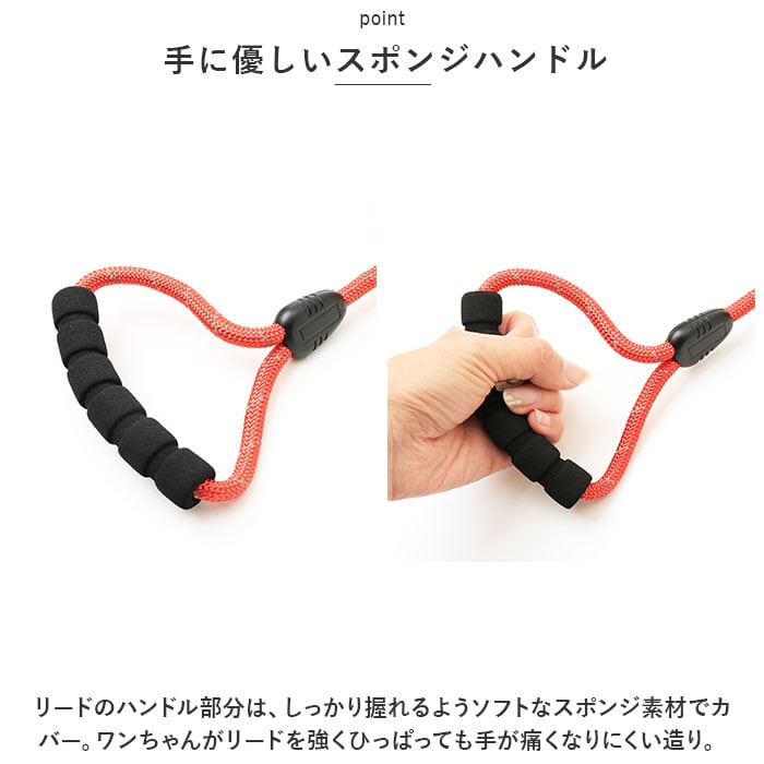 ・リードのハンドル部分は、しっかり握れるようソフトなスポンジ素材でカバー。ワンちゃんがリードを強くひっぱっても手が痛くなりにくい造り。
