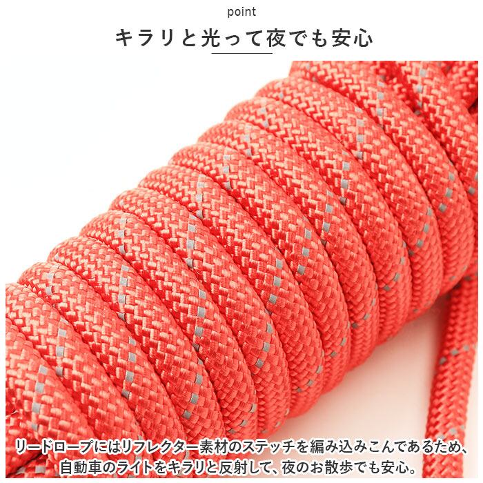・リードロープにはリフレクター素材のステッチを編み込みこんであるため、自動車のライトをキラリと反射して、夜のお散歩でも安心。