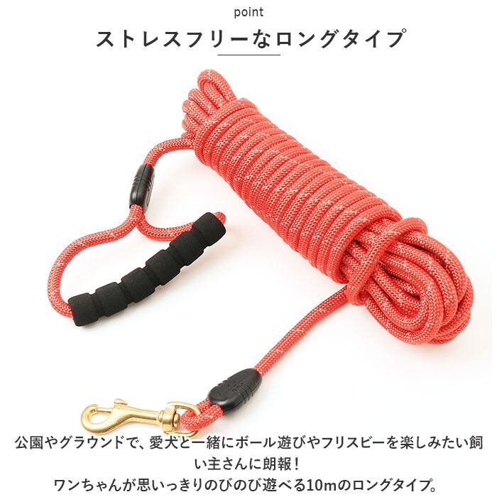 ・公園やグラウンドで、愛犬と一緒にボール遊びやフリスビーを楽しみたい飼い主さんに朗報!ワンちゃんが思いっきりのびのび遊べる10mのロングタイプ。