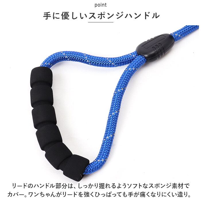 ・リードのハンドル部分は、しっかり握れるようソフトなスポンジ素材でカバー。ワンちゃんがリードを強くひっぱっても手が痛くなりにくい造り。