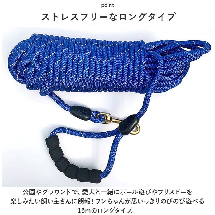・公園やグラウンドで、愛犬と一緒にボール遊びやフリスビーを楽しみたい飼い主さんに朗報!ワンちゃんが思いっきりのびのび遊べる15mのロングタイプ。