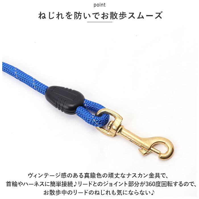 ・ヴィンテージ感のある真鍮色の頑丈なナスカン金具で、首輪やハーネスに簡単接続♪リードとのジョイント部分が360度回転するので、お散歩中のリードのねじれも気にならない♪