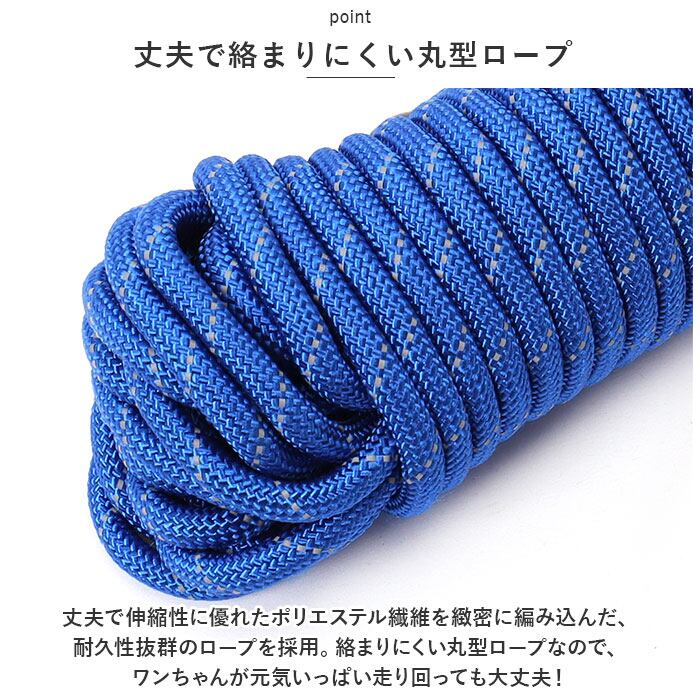 ・丈夫で伸縮性に優れたポリエステル繊維を緻密に編み込んだ、耐久性抜群のロープを採用。絡まりにくい丸型ロープなので、ワンちゃんが元気いっぱい走り回っても大丈夫!