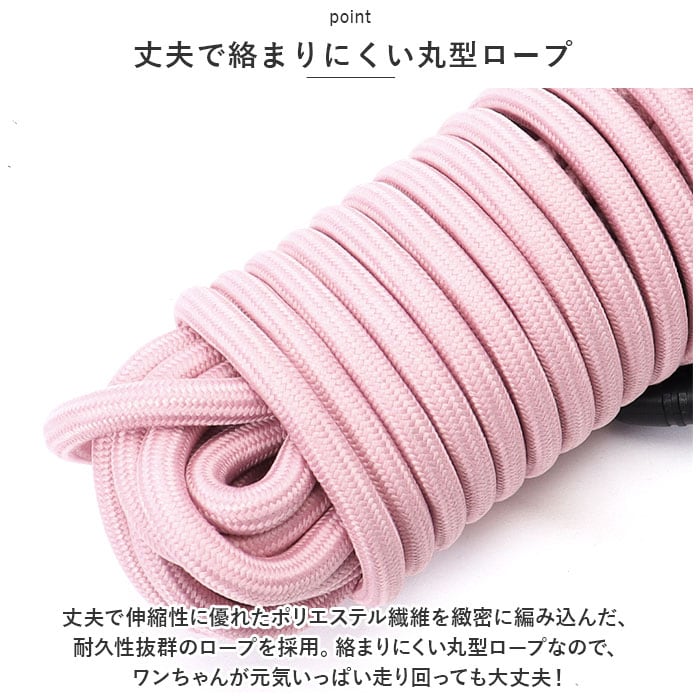 ・丈夫で伸縮性に優れたポリエステル繊維を緻密に編み込んだ、耐久性抜群のロープを採用。絡まりにくい丸型ロープなので、ワンちゃんが元気いっぱい走り回っても大丈夫!