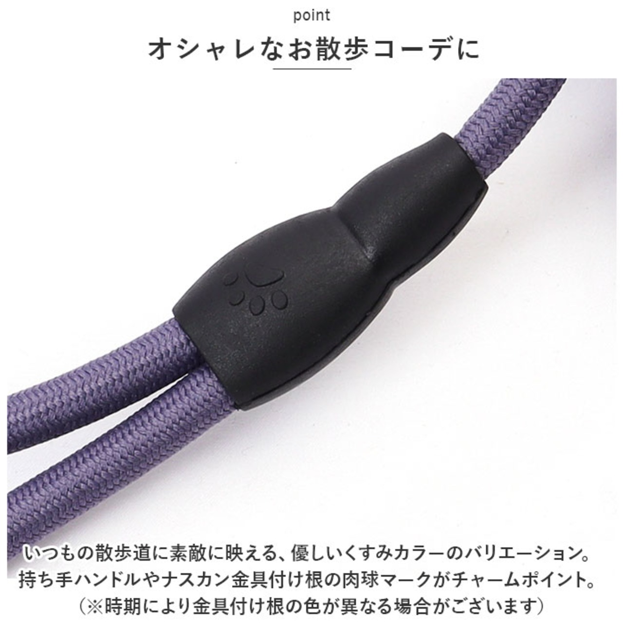 ・いつもの散歩道に素敵に映える、優しいくすみカラーのバリエーション。持ち手ハンドルやナスカン金具付け根の肉球マークがチャームポイント。