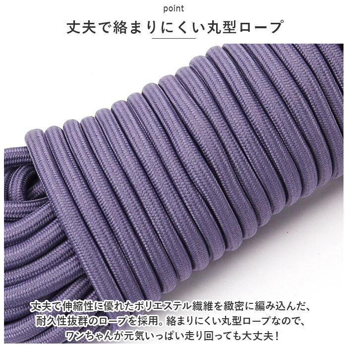 ・丈夫で伸縮性に優れたポリエステル繊維を緻密に編み込んだ、耐久性抜群のロープを採用。絡まりにくい丸型ロープなので、ワンちゃんが元気いっぱい走り回っても大丈夫!
