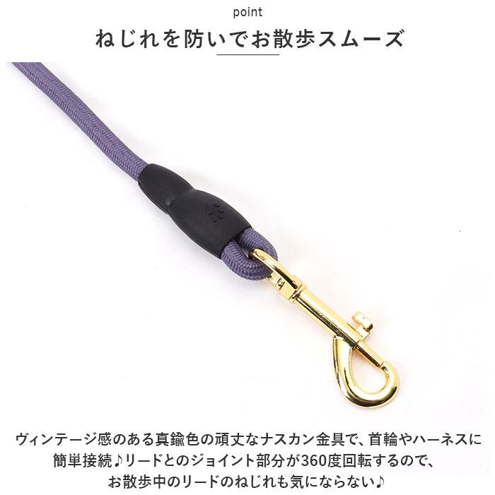 ・ヴィンテージ感のある真鍮色の頑丈なナスカン金具で、首輪やハーネスに簡単接続♪リードとのジョイント部分が360度回転するので、お散歩中のリードのねじれも気にならない♪