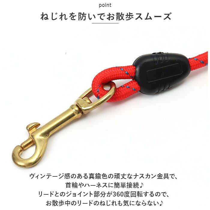 ・ヴィンテージ感のある真鍮色の頑丈なナスカン金具で、首輪やハーネスに簡単接続♪リードとのジョイント部分が360度回転するので、お散歩中のリードのねじれも気にならない♪