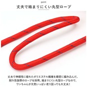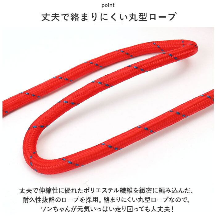 ・丈夫で伸縮性に優れたポリエステル繊維を緻密に編み込んだ、耐久性抜群のロープを採用。絡まりにくい丸型ロープなので、ワンちゃんが元気いっぱい走り回っても大丈夫!