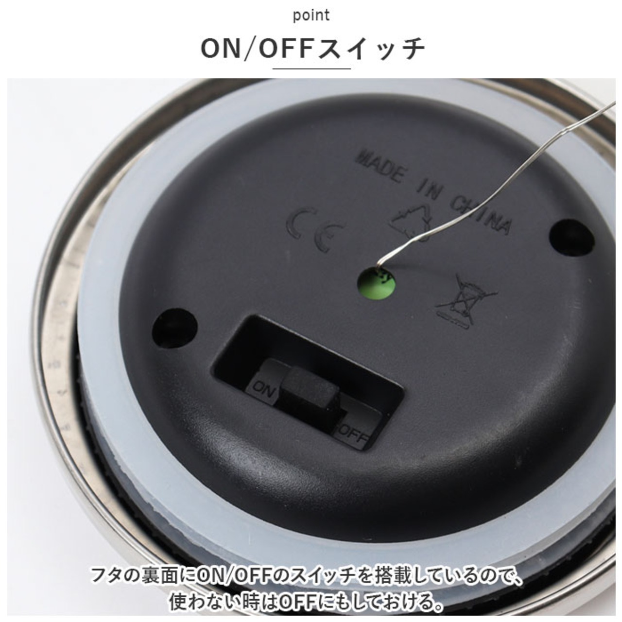 ・フタの裏面にON/OFFのスイッチを搭載しているので、使わない時はOFFにもしておける。