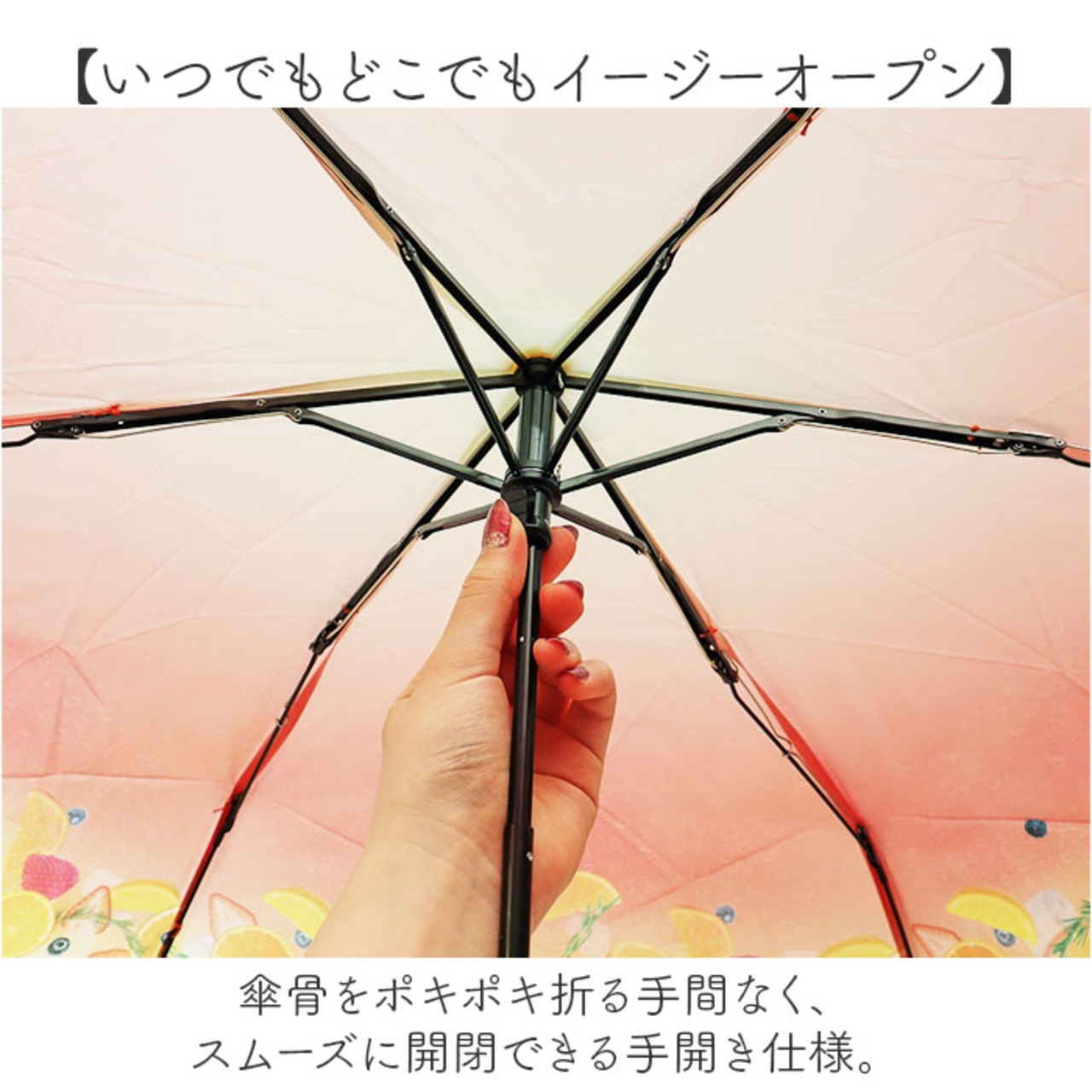 ・傘骨をポキポキ折る手間なく、スムーズに開閉できる手開き仕様。